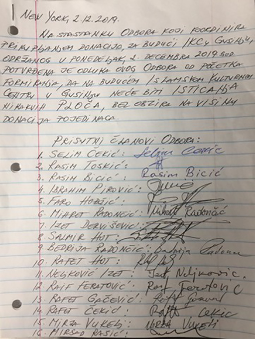 U atacmentu ispod je jednoglasna odluka našeg Odbora iz NY koji koordinira akcijom prikupljanja donacija (svih 16 prisutnih članova glasali za odluku), kojom se potvrdjuje odluka od 16. novembra 2018. godine da se na objektu budućeg IKC u Gusinju NE postavljaju NIKAKVE PLOČE sa imenima donatora" - stoji u saopštenju Odbora iz New Yorka koji koordinira akcijom prikupljanja donacija za izgradnju IKC u Gusinju
