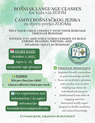 Let’s keep our language and traditions alive! Bosniak language classes for children (via Zoom) begin October 1st. Twice a week, children will practice vocabulary, spelling, reading, writing, and speaking everyday words and phrases, while also learning about traditions in a fun and interactive way.   For registration and details, please email: bosniakclasses@gmail.com