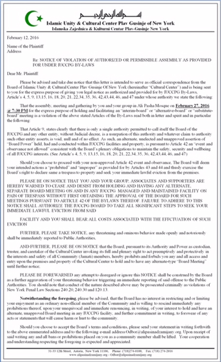 7. Da bi dokazali da u svojoj podlosti nemaju kraja, odlucili su se na najprljaviji, naruzniji i najogavniji postupak u istoriji Islamske Zajednice u New Yorku tako sto su podnjeli tuzbu vrhovnom sudu u Queens-u, uz tuzbu predali zvanican Statut IZ-e iz 2002 g., unajmljujuci nemuslimana da ih zastupa i ponovo iznjeli tri monstruozne lazi, i to:
