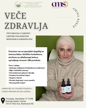 Veče Zdravlja u Zajednici: Liječenje Poslanikovom Medicinom & Porodična Noć - Četvrtak, 11. decembar • 18:00h Bošnjački islamski kulturni centar Richmond Hill Pozivamo vas na specijalni događaj sa Aminom Baker, kliničkim herbalistom, stručnom za ublažavanje bolova, upravljanje stresom i IBD protokole. Teme i usluge: • Liječenje nadahnuto Poslanikovom medicinom • Biljni i holistički tretmani • Personalizovani planovi zdravlja • Posebno formulirani čajevi • Savjeti o ishrani • Kinesko kupiranje i suva masaža • Homeopatski savjeti Dobrodošli svi — povedite porodicu i otkrijte prirodne metode liječenja.