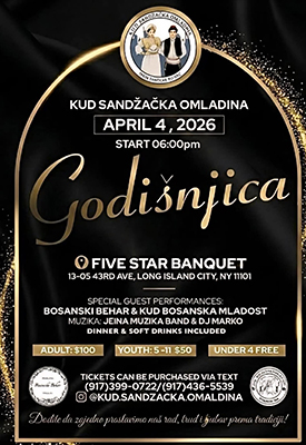 Srdačno pozivamo našu zajednicu, prijatelje i porodice da nam se pridruže u obilježavanju ove posebne godišnjice. Tokom protekle godine izgradili smo nova prijateljstva, čuvali našu kulturu i zajedno stvorili nezaboravne uspomene.  Dođite da zajedno proslavimo, podržimo našu omladinu i budemo dio narednog poglavlja našeg zajedničkog puta. Vaše prisustvo nam mnogo znači!   Radujemo se da slavimo zajedno s vama!   4. April 2026 u 6:00pm  Five Star Banquet  13-05 43rd Ave  Long Island City NY 11101