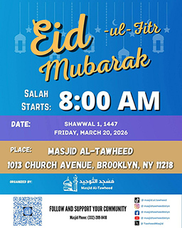 Esselamu alejkum, Sa velikim zadovoljstvom vas pozivamo da zajedno obilježimo Ramazanski Bajram u našoj zajednici. Bajram-namaz će se klanjati u 8:00 ujutro, u petak, 20. marta 2026. godine (1. Ševval 1447), u Masjid Al-Tawheed, na adresi 1013 Church Avenue, Brooklyn, NY. Bajramsku hutbu će održati Ahmed Kurtagic.
