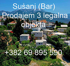 EXCLUSIVNO! Na samo 250 od plaže Ŝušanj (Bar) prodajem 3 potpuno legalna objekta sa 1.000m2 placa. Objekti se sastoje iz 4 stana i mini spa i teretane. Svi objekti su priključeni na gradsku vodu, kanalizaciju i struju, potpuno rekonstruisani i sa svim potrebnim nameštajem i opremom, spremno za življenje ili za turistički najam. U blizini je vrtić, škola, marketi, posta... Cijena 360.000€. Bez tereta i ograničenja, vlasnik 1/1. Za ozbiljnog kupca mogući su pregovori oko cijene i plaćanje u gotovini. Kontakt: +382 69 895 590 (Viber, WhatsApp)