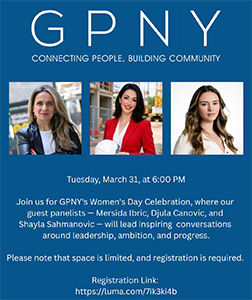 GPNY događaj povodom Dana žena - Utorak, 31. mart od 6pm-8pm, adresa: 900 3rd Ave, New York, NY 10022 Pridružite nam se na proslavi Dana žena u GPNY-u gdje će naše gostujuće panelistice Mersida Ibrić, Đula Canović i Shayla Šahmanović voditi inspirativne razgovore o liderstvu, ambiciji i napretku. Imajte na umu da je broj mjesta ograničen i da je registracija obavezna. Link za registraciju: https://luma.com/7ik3ki4b